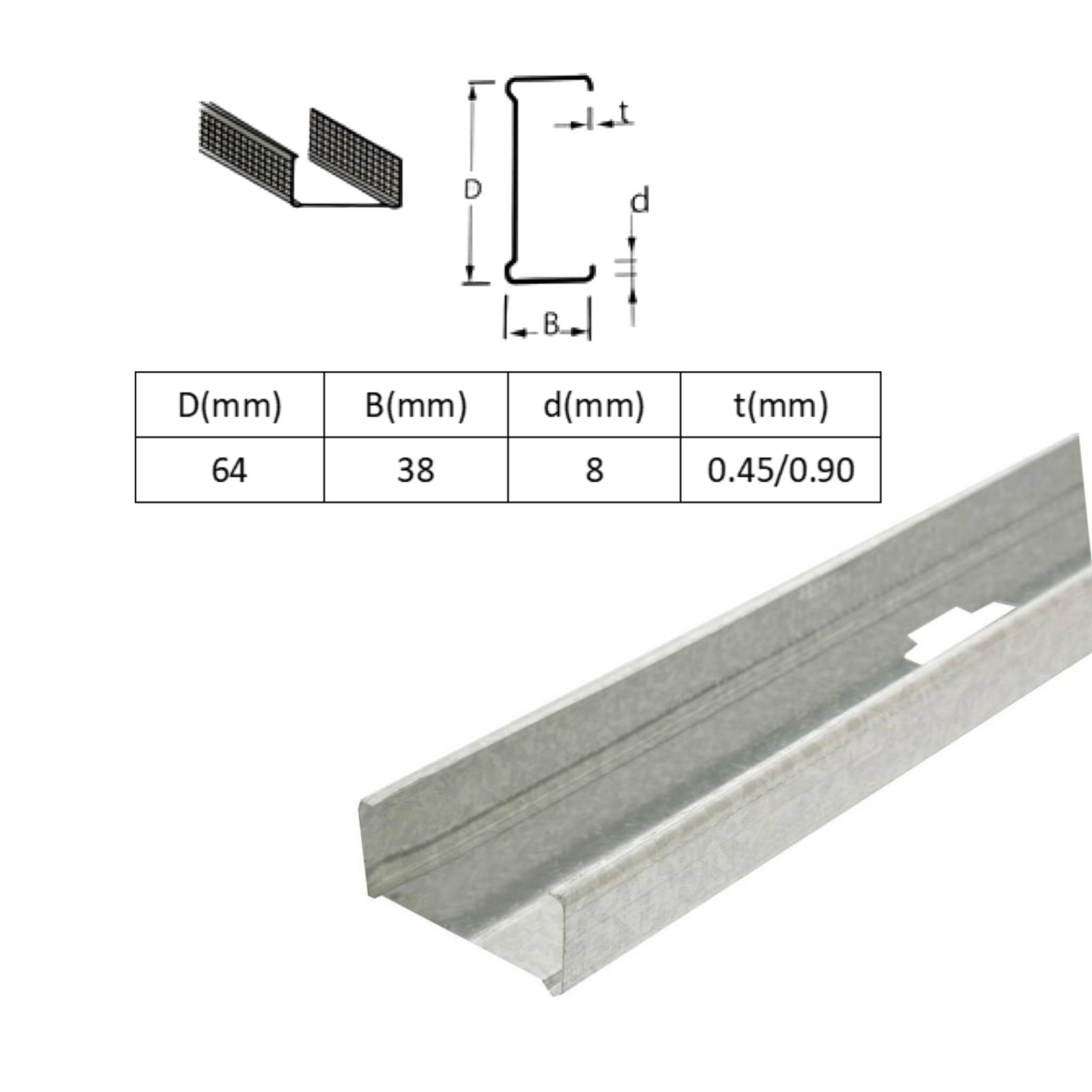 Es un perfil estructural de acero galvanizado ligero, diseñado para tabiques de drywall. Ofrece alta resistencia a la corrosión, es incombustible, fácil de instalar y versátil para divisiones interiores, cielorrasos y estructuras livianas