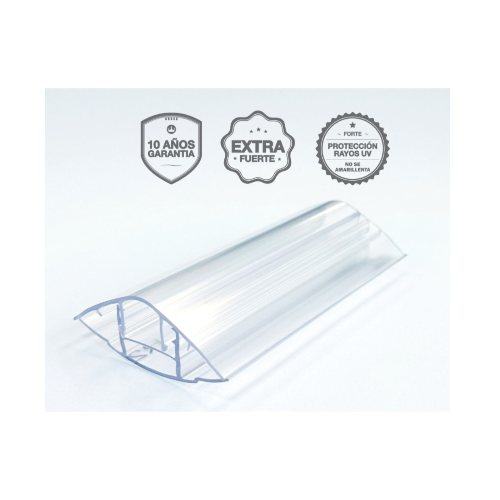 (base y tapa) Es un sistema de policarbonato de dos piezas diseñado para unir, fijar y sellar planchas de policarbonato alveolar en techos o fachadas sin necesidad de perforarlas. Destaca por su alta resistencia, filtro UV, transparencia y fácil instalación a presión, siendo compatible con espesores de 4 a 10 mm.